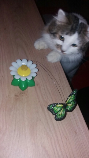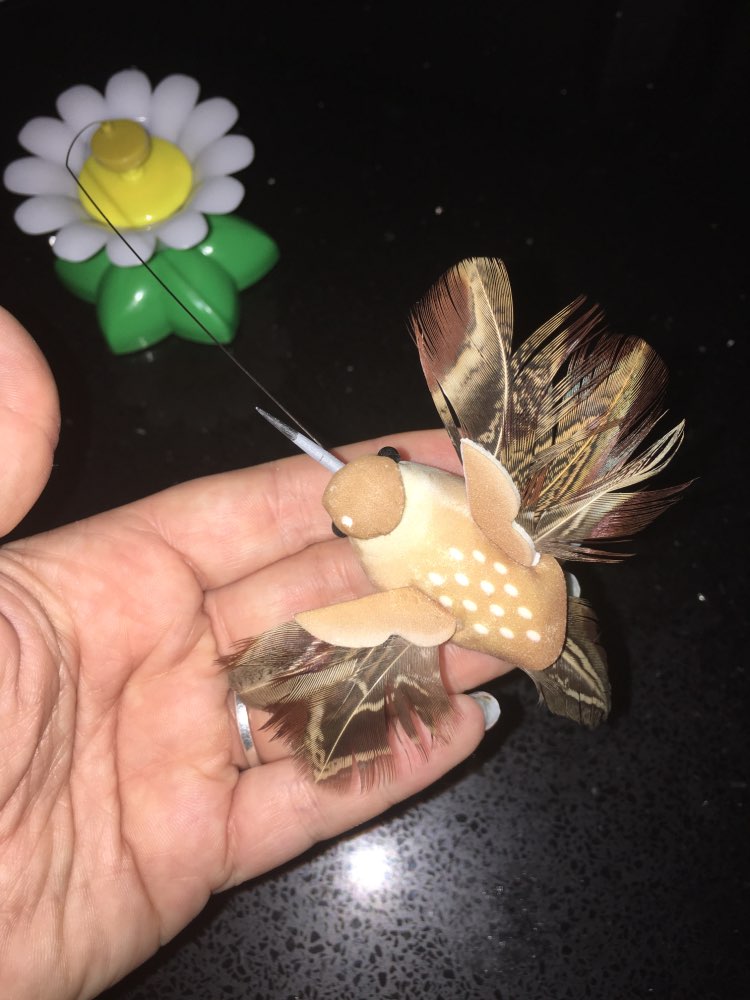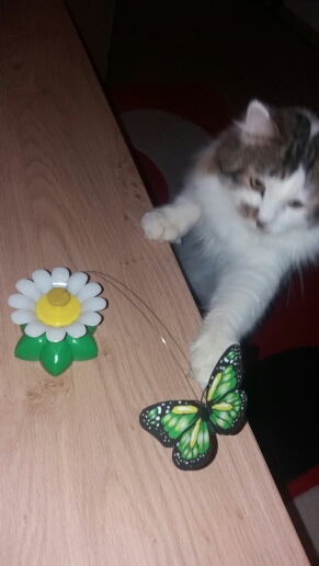 Zábava pre mačku alebo mačiatko. Hračka pestrofarebný motyľ alebo vtáčik je upevnený na jemnom drôtiku, ktorý rotuje. Lietajúci motýľ určite zaujme nielen vašu mačičku ale veľa zábavy si užijete i vy.