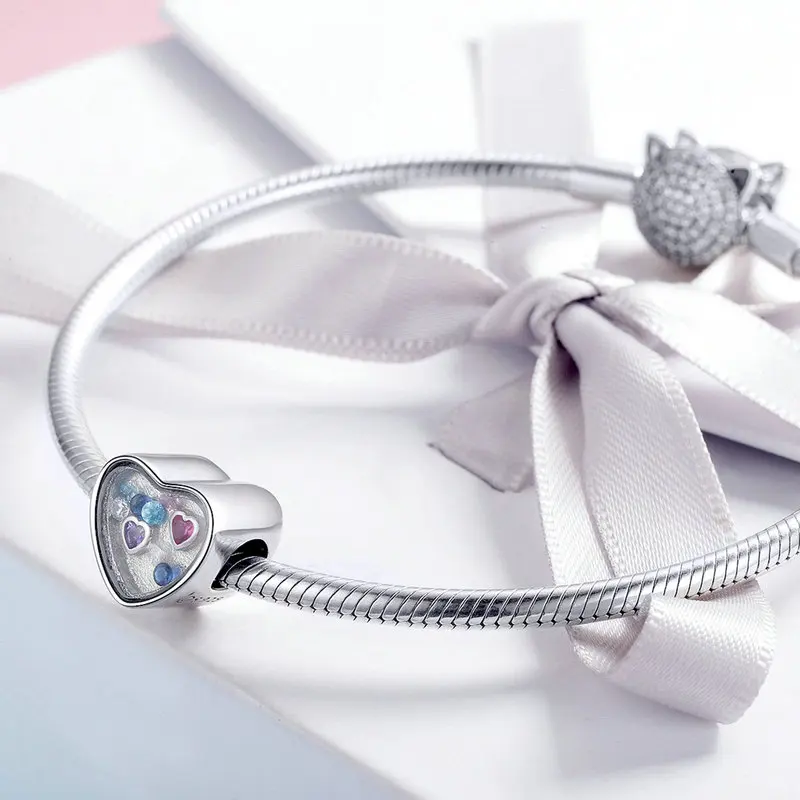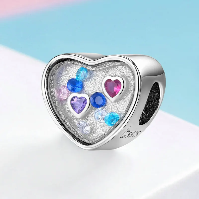 Pekná strieborná korálka v tvare srdca. Nadčasovú eleganciu dodávajú srdiečku nádherne sfarbené drobné srdiečka jemnými pastelovými farbami kryštálmi zirkónu.