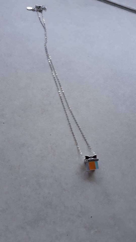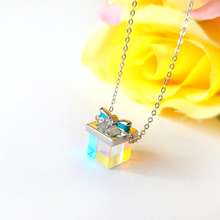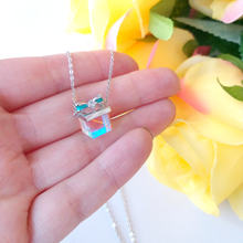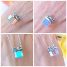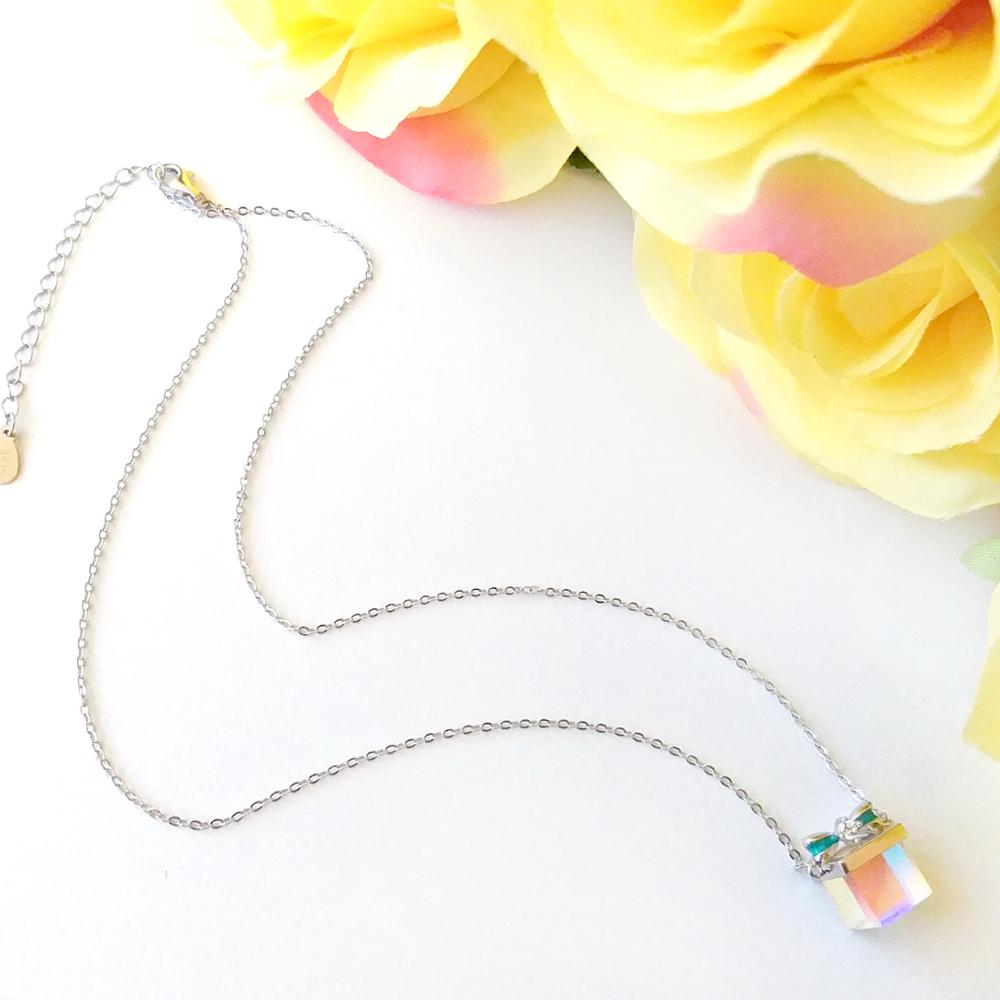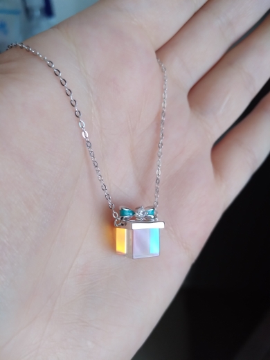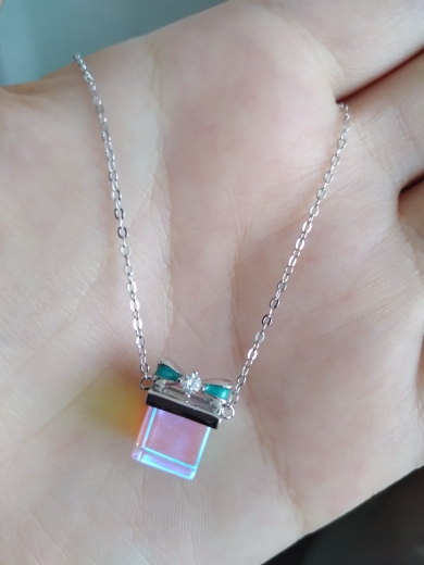 Náhrdelník je vyrobený zo striebra s925, dĺžka retiazky je cca 40cm (+5cm). Prívesok, kocka s mašľou, je z čistého vysoko kvalitného syntetického kryštálu  AAA cubic zircon, v ktorom sú ukryté nečakané kombinácie farieb, veľkosť darčeka je cca 0,8cm.