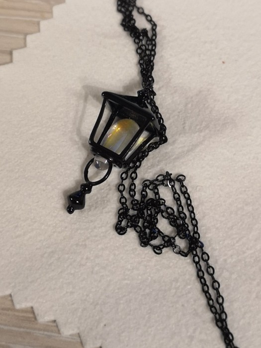 This necklace is super cute! The color of the bead inside the lamp changes shades depending on where the light shines. Love the designer of this necklace! I am satisfied and I very recommend.